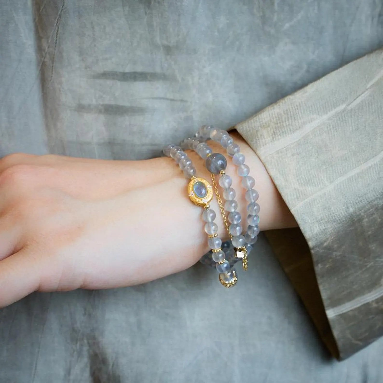 A luminous fusion of intuitive power and energetic clarity, this bracelet blends the dreamy shimmer of Grey Moonstone with the high-vibration clarity of Clear Quartz.